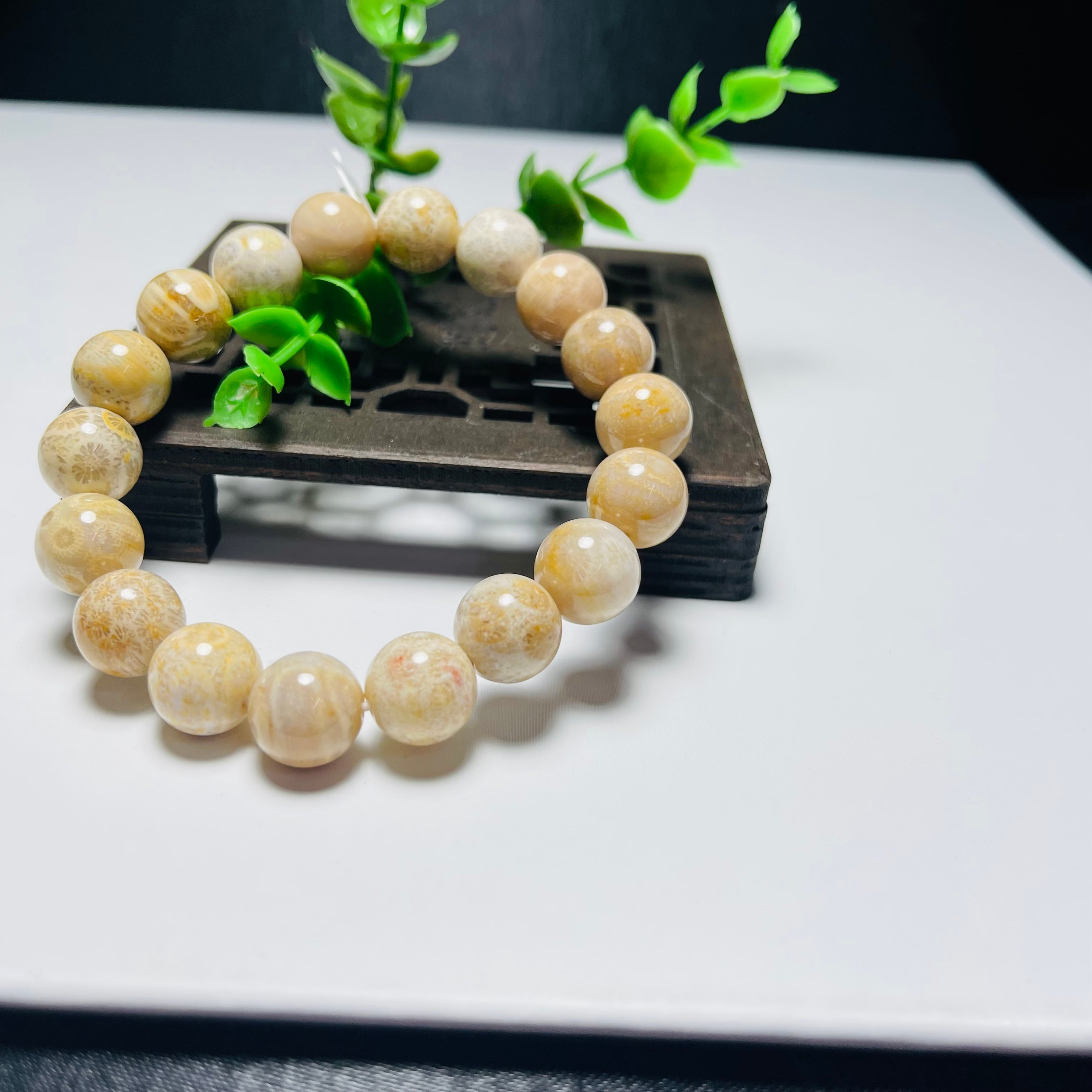イエロー珊瑚化石ブレスレットは、自然の力を身に纏うアクセサリーです。一つ一つの珊瑚化石には、海の底に眠っていた数千年以上の時が刻まれています。