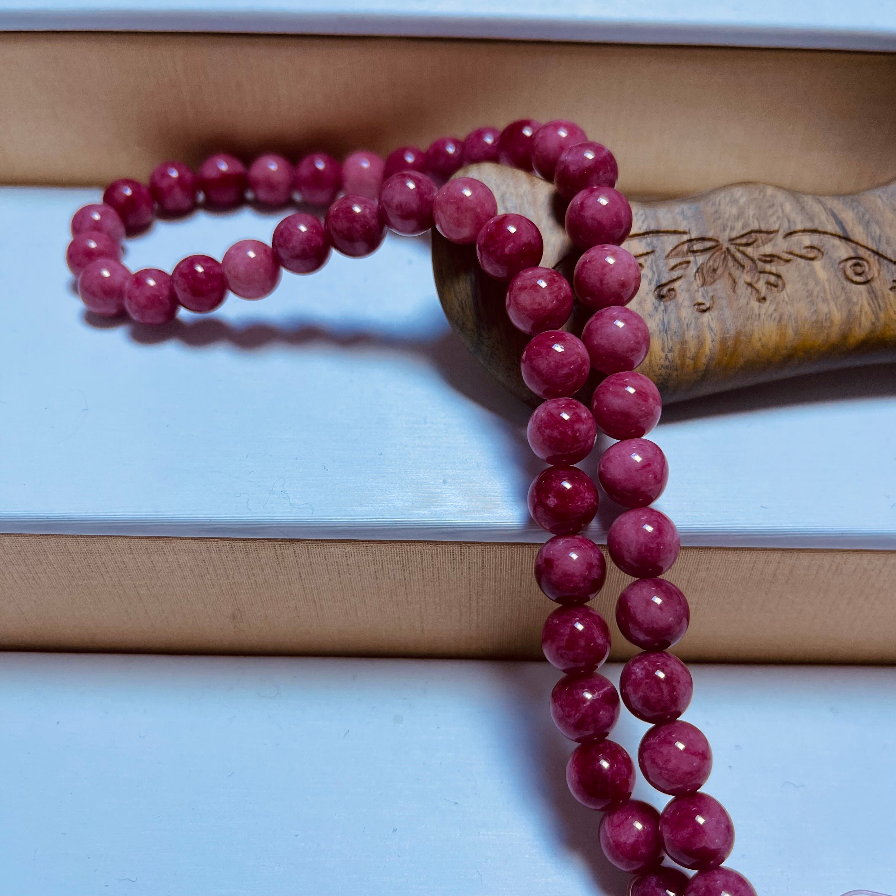 シンプルかつ上品なデザインの合成薔薇石蓮材。透明感のある薔薇石が美しく輝き、華やかな蓮の花がアクセントになっています。薔薇と蓮の組み合わせは、古来より「愛と清廉」「美と慈悲」といった意味を持ち、持ち主に幸福と穏やかさをもたらすと言われています。